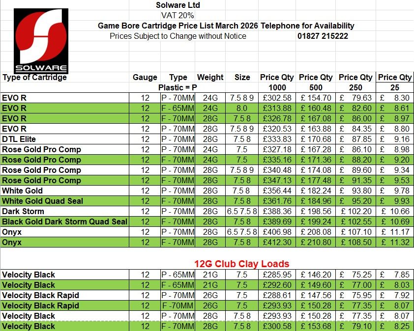 Gamebore Cartridges Price List